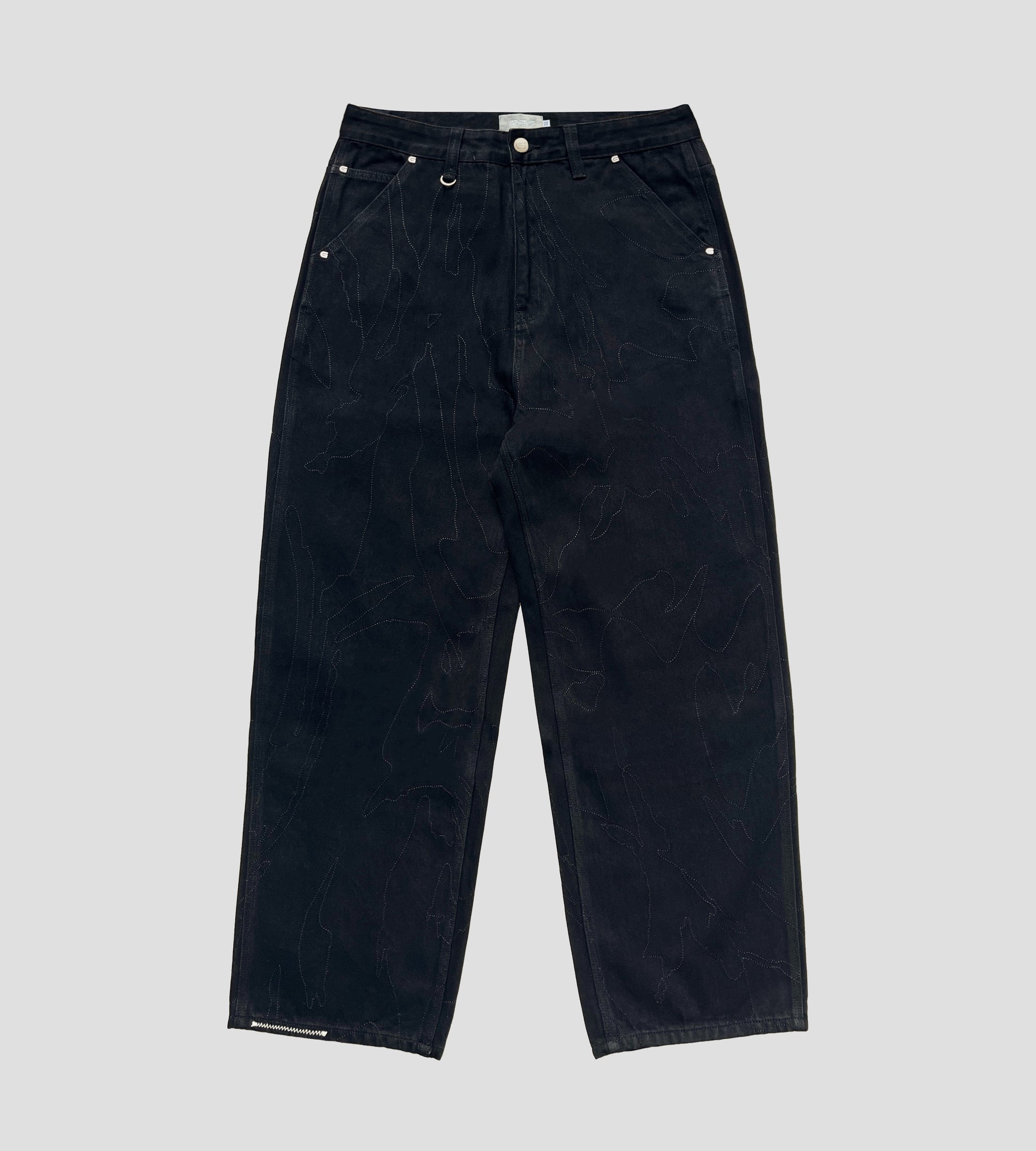 All-over embroidered camo pattern in tone-on-tone black. This collab piece with Goldblok Brussels features 'G' rivets on the front pockets, flag labels on the back pocket & white stitching stroke on the back pocket and right ankle cuff.