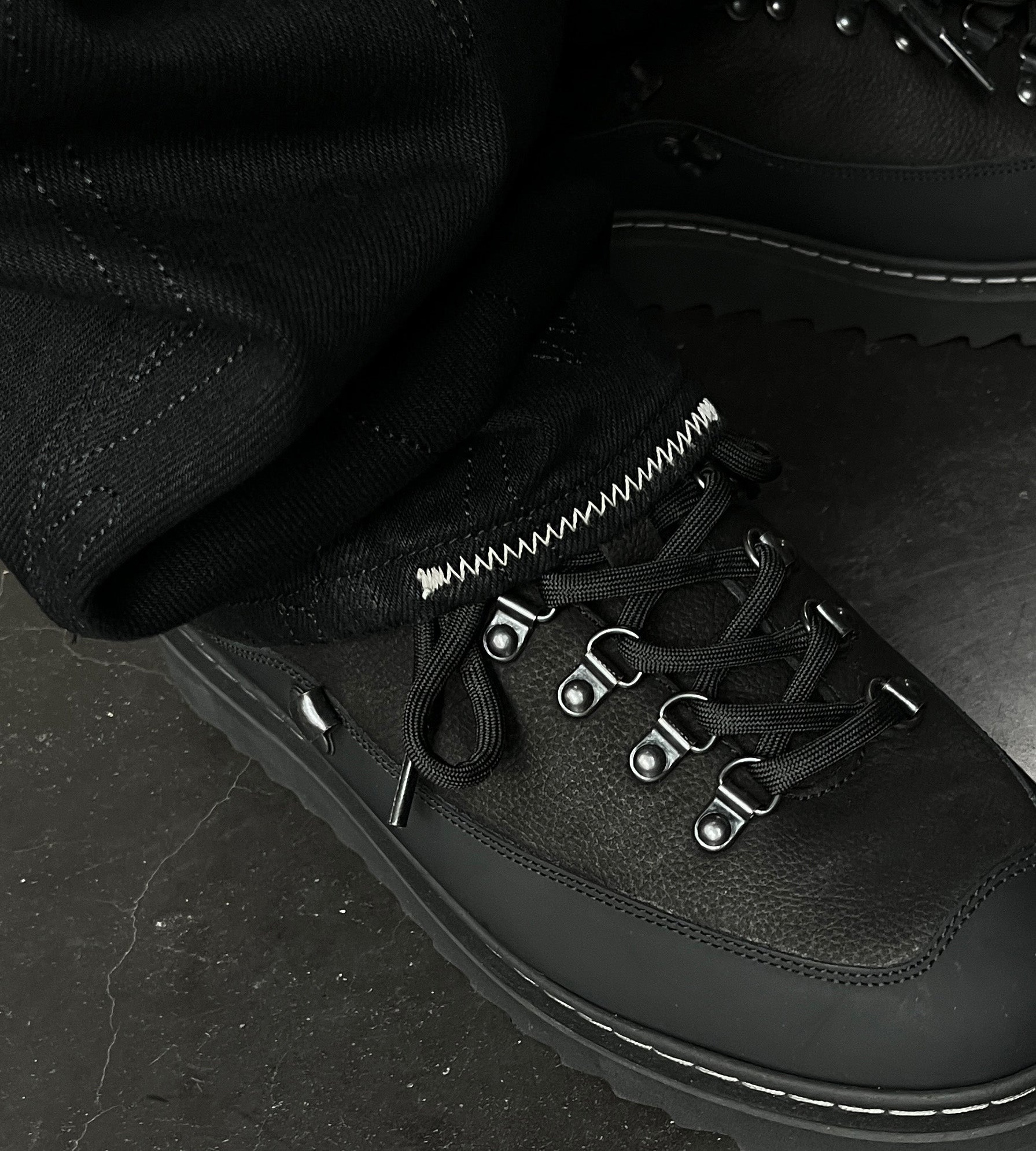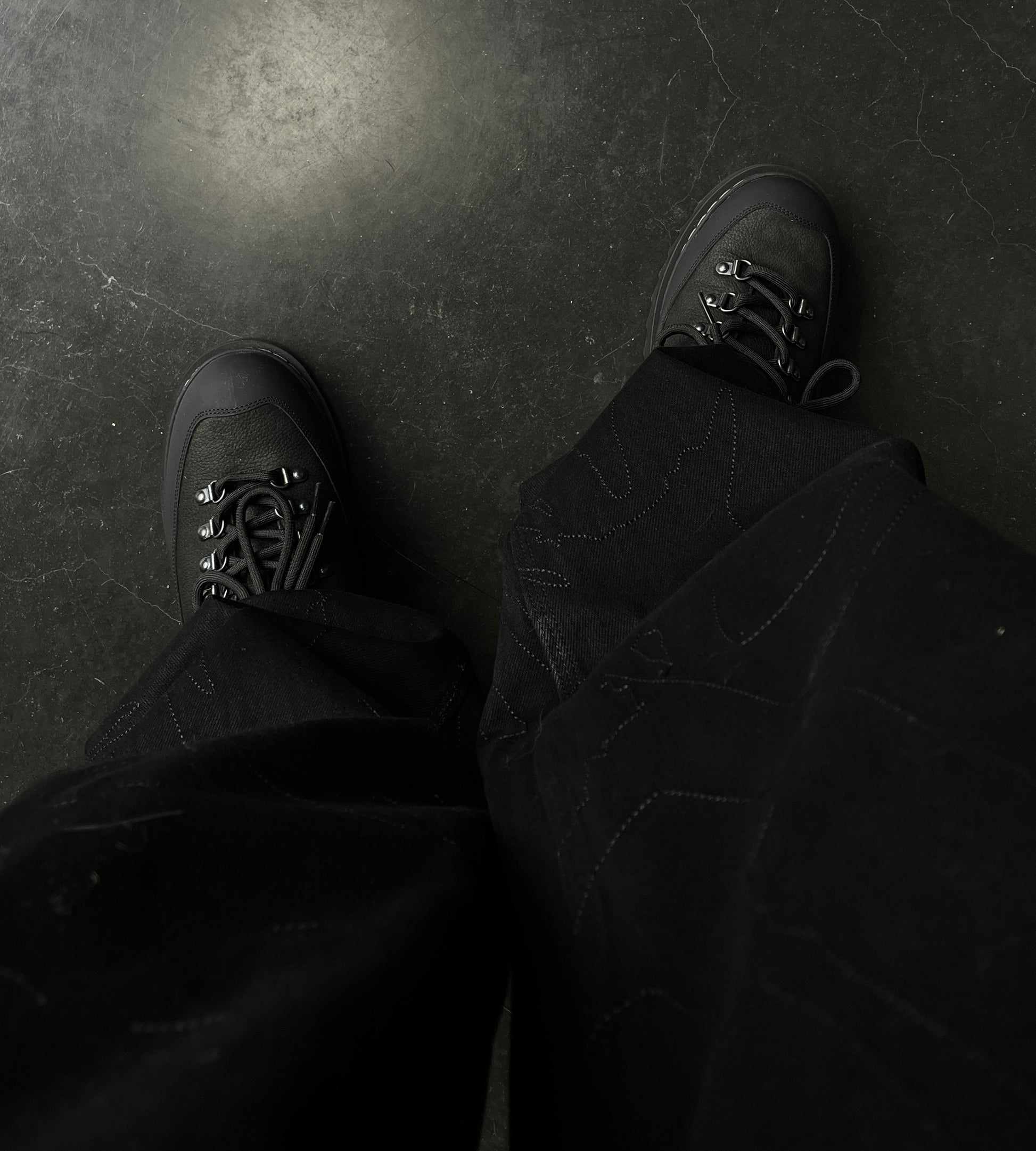 13oz 100% Cotton Denim in black, with a slightly washed finish.